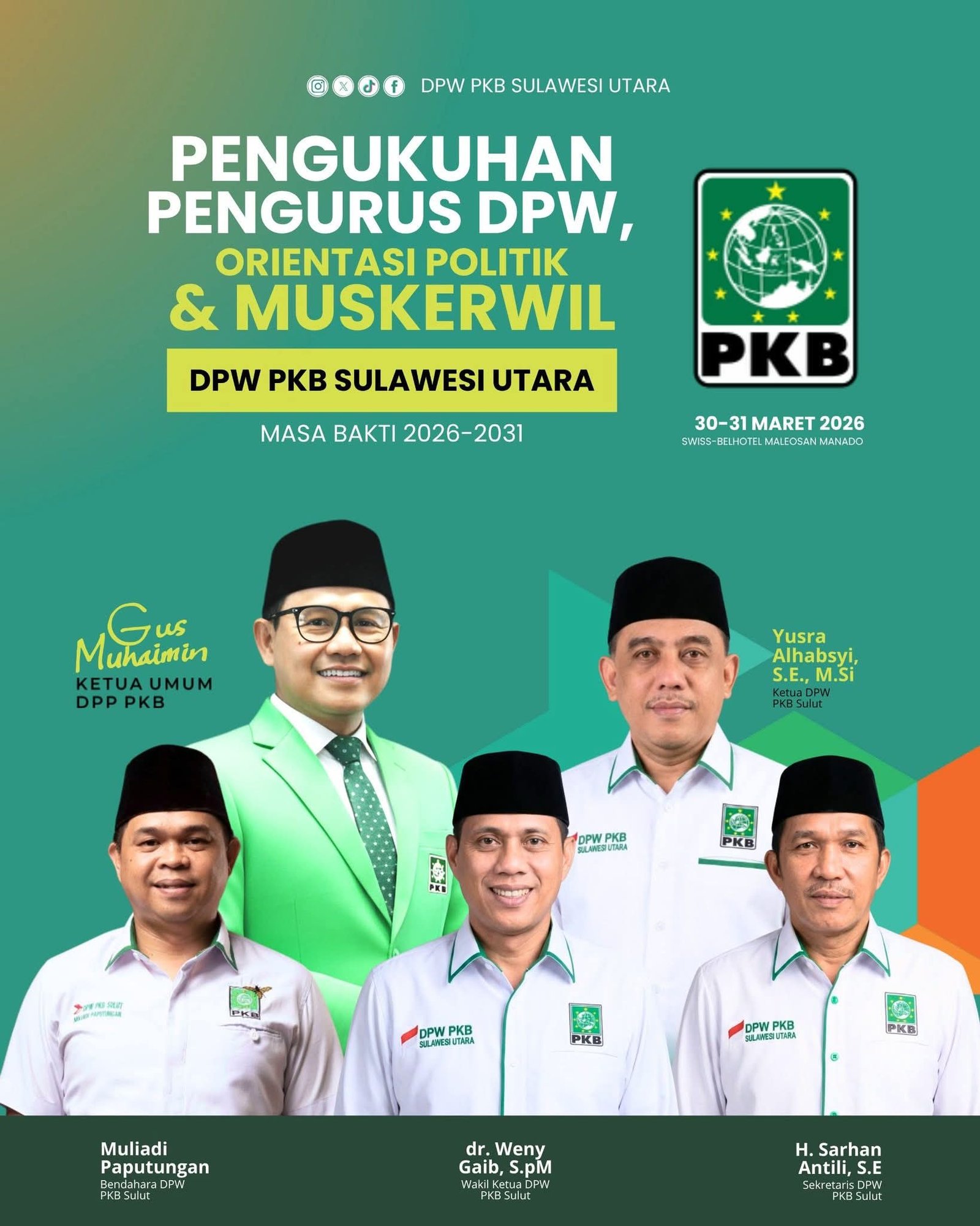 SulutMaju. Com – Dewan Pengurus Wilayah (DPW) Partai Kebangkitan Bangsa (PKB) Sulawesi Utara resmi dikukuhkan melalui rangkaian kegiatan Pengukuhan Pengurus, Orientasi Politik, dan Musyawarah Kerja Wilayah (Muskerwil) yang berlangsung di Swiss-Belhotel Maleosan, Senin (30/3/2026).