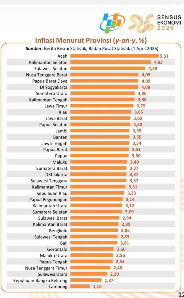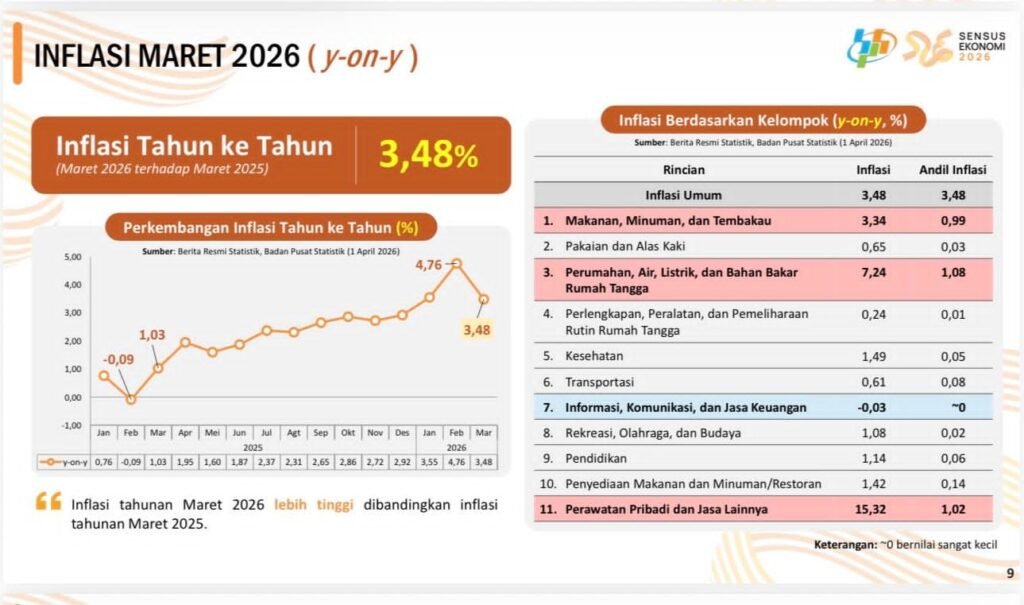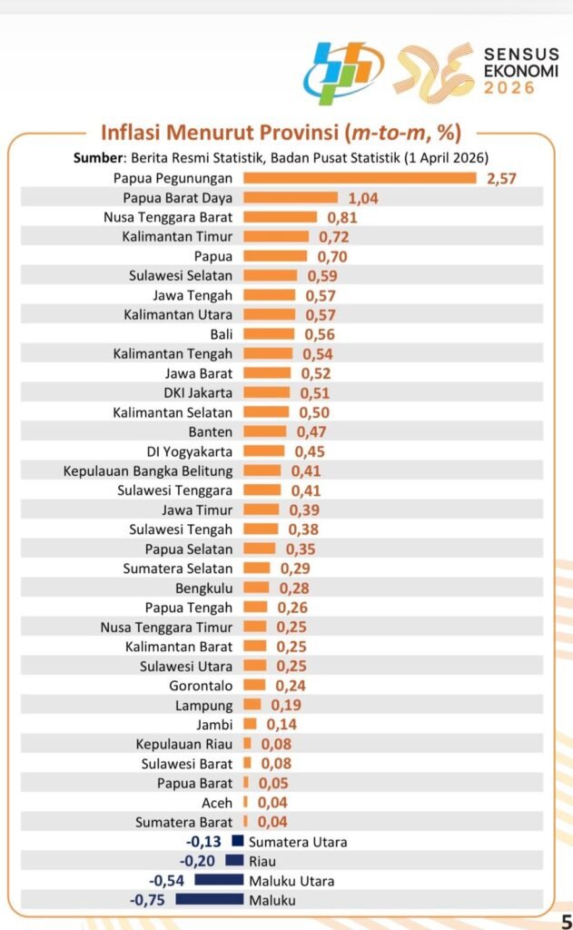 Secara nasional, kelompok makanan, minuman, dan tembakau memberikan andil terbesar pada inflasi Maret 2026, dengan komoditas utama seperti ikan segar, daging ayam ras, beras, telur ayam ras, dan cabai rawit. Namun, melalui langkah-langkah strategis Pemerintah Provinsi Sulawesi Utara dalam menjaga rantai pasok, tekanan pada komoditas pangan di daerah dapat diminimalisir.